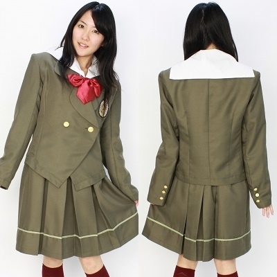 カーキカラーが可愛い!お嬢様系制服コスチューム。ジャケットの胸元には、しっかりとした刺繍製のワッペン入り!カーキ色が赤いリボンを際立たせます!セーラー襟のシャツや、スカートに入ったラインもオシャレな制服コスプレ衣装です