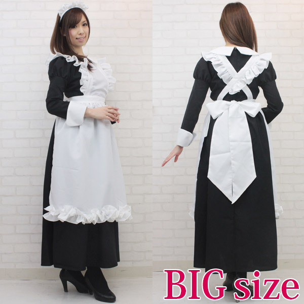 BIGサイズ:B92〜103cm・W70〜90cm 丈:ワンピース130cm(肩幅40cm、袖丈57cm)、エプロン115cm セット内容:ワンピース(首周りホック有り、後ろファスナー)・エプロン(2段階長さ調節ボタンあり)・カチューシャ