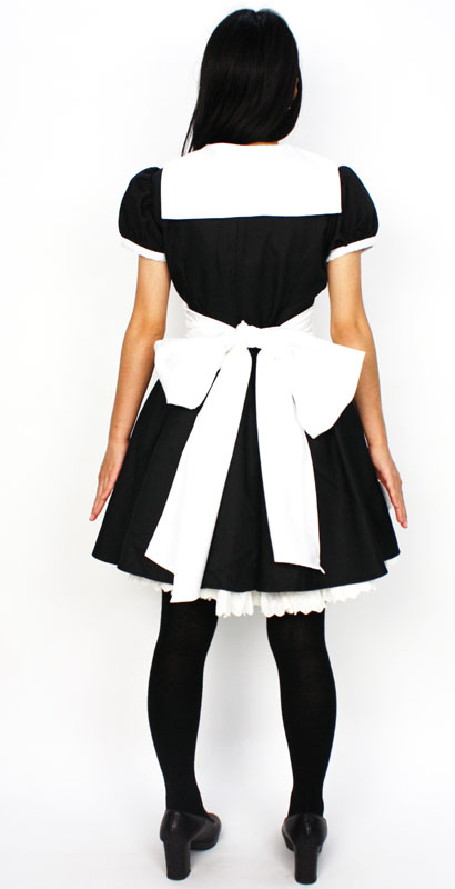 BIGサイズ:B92〜100cm・W78〜84cm 丈:ワンピース88cm(袖丈19cm)・ペチコート50cm セット内容:ワンピース(後ろファスナー、袖パフスリーブ、全円スカート、内側に襟固定用のボタン付)・エプロン・ペチコート(裾レース付、ウェストゴム仕様)・カチューシャ・ブローチ(安全ピン付)