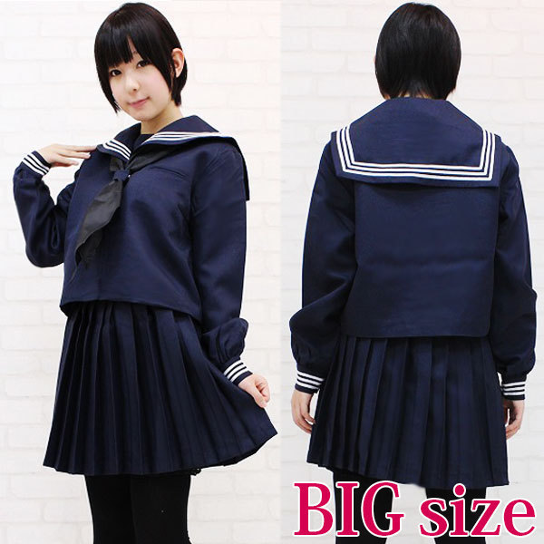 大きめスカーフが特徴の制服コスプレ!長袖の冬服バージョンです。スタンダードなデザインの紺一色の上下に、スカーフもセット!一式揃ったセーラー服のコスプレ衣装です。襟と袖口には三本ライン、胸元には刺繍入り。※水洗い不可、塩素系漂白剤による漂白不可、アイロンは中温で当て布使用、ドライクリーニング可、色落ちの可能性があります。※こちらの商品は在庫の状況によりお届けまでに4日〜7日程度かかる場合がございます。