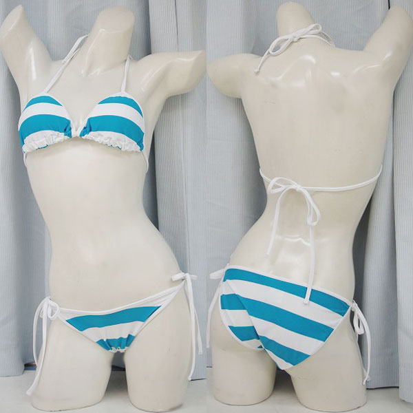 パステルカラーで萌え感たっぷり!ターコイズ×ホワイトのボーダー柄ビキニセットが登場しました。太めのしま模様がとってもラブリー!ホルターネックの三角ビキニはブラパット付き、ショーツのサイドリボンは取り外しが可能な紐パン仕様です。キュートなしましま水着でビーチやプールへGO!※水洗い可、塩素系漂白剤による漂白不可、アイロンは中温で当て布使用、ドライクリーニング可※こちらの商品は在庫の状況によりお届けまでに4日〜7日程度かかる場合がございます。