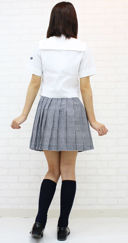 Mサイズ:B78〜88cm・W58〜73cm 丈:上着47cm(袖丈22cm、肩幅36cm)・スカート46.5cm セット内容:上着(ピケ生地使用、前ボタン留め、金ボタン、左袖に校章付き)・スカート(横ファスナー、アジャスター有り、黒ギンガムチェック生地)
