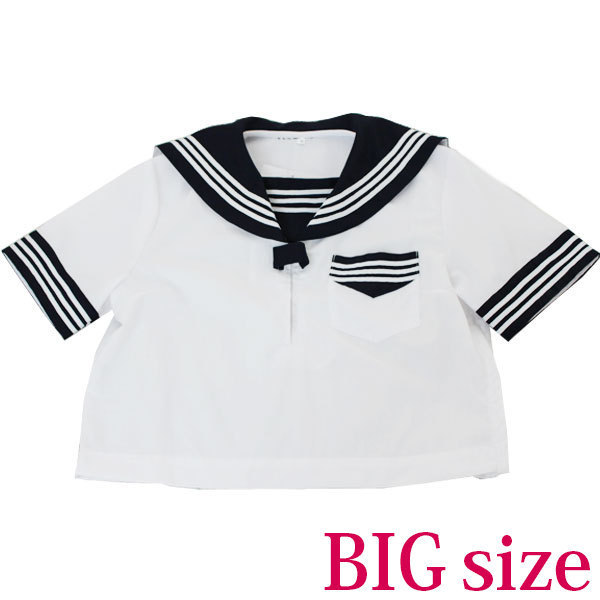 自分流にアレンジできちゃう!爽やかな夏服タイプの半袖セーラーブラウス単品(BIG)。襟や袖、胸ポケットに入った白の3本ラインがオシャレ!一着は持っておきたい定番のセーラー服コスプレです。お気に入りのスカートや、お手持ちのスカーフとあわせて可愛く着こなしてください!※水洗い不可、塩素系漂白剤による漂白不可、アイロンは中温で当て布使用、ドライクリーニング可、色落ちの可能性があります。※こちらの商品は在庫の状況によりお届けまでに4日〜7日程度かかる場合がございます。