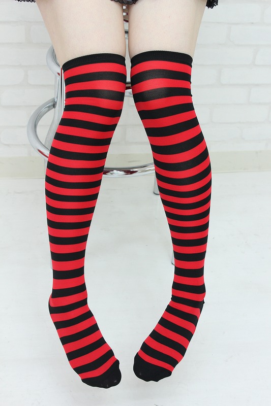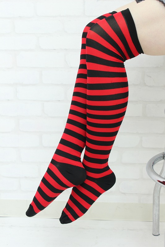 コスチュームのアクセントに!レッド×ブラックのボーダー柄ニーハイ。1cm幅の細めボーダーがとってもキュート!コスプレ衣装はもちろん、私服にもコーディネート出来ちゃう優れもの!ヘビロテ確実のしましま柄ニーハイソックスです。