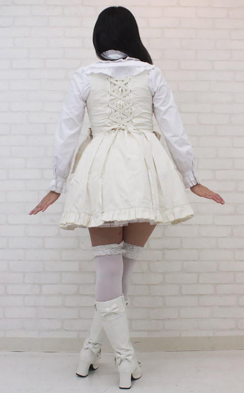 ふんわりフリルが可愛いロリータ服!クラシカルなオフホワイトのジャンパースカート&長袖ブラウスセット(BIG)。パニエが一体型になっているので、ふんわり感を簡単に出せます。ウエスト両サイドのリボンが印象的!背面の編み上げはバックスタイルをキュートに見せてくれます。胸元の刺繍モチーフなど、細部に至るまでデザインにこだわったロリィタコスチュームです。※水洗い不可、塩素系漂白剤による漂白不可、アイロンは中温で当て布使用、ドライクリーニング可、色落ちの可能性があります。※こちらの商品は在庫の状況によりお届けまでに4日〜7日程度かかる場合がございます。