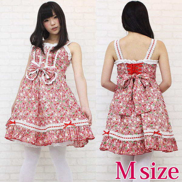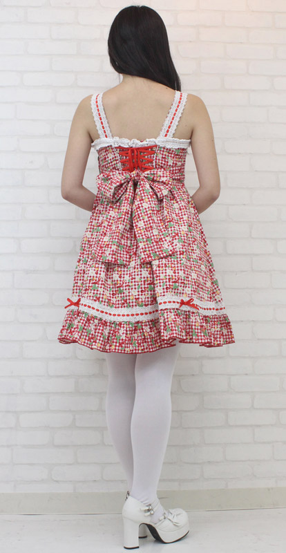 真っ赤なチェリー&ベリーでキュートに仕上げた、ギンガムチェックのジャンパースカート(M)。たっぷりのフリルとリボンが超ラブリーなコスチューム!フロントの大きなリボンはピンで取り外しが出来るので、お好きなアレンジが楽しめます。背面は編み上げになっており、リボンは結ぶ仕様となっています。※水洗い不可、塩素系漂白剤による漂白不可、アイロンは中温で当て布使用、ドライクリーニング可、色落ちの可能性があります。※こちらの商品は在庫の状況によりお届けまでに4日〜7日程度かかる場合がございます。