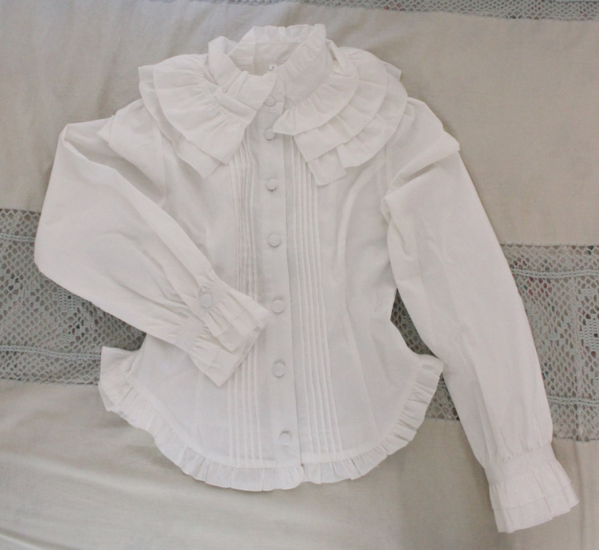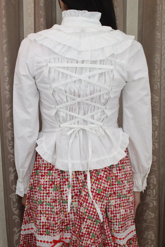 プリンセス気分が盛り上がるたっぷりフリル!クラシカルな世界観を楽しめる純白のブラウス単品(M)。襟元のフリルがとっても可愛く、肌触りが良いので着心地も良好!バックはシャーリングの入った編み上げになっていて、ゴスロリやコスプレ衣装とも相性ぴったり!一枚は持っておきたいキュートなブラウスです。※水洗い不可、塩素系漂白剤による漂白不可、アイロンは中温で当て布使用、ドライクリーニング可、色落ちの可能性があります。※こちらの商品は在庫の状況によりお届けまでに4日〜7日程度かかる場合がございます。