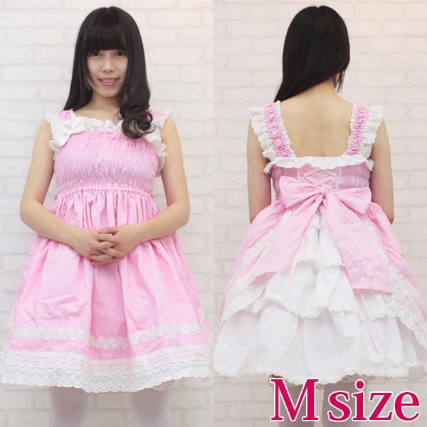 甘ロリピンクが可愛い!豪華なフリルレースで仕上げたシャーリングジャンパースカート(M)。ボリューミーな後ろ姿がとっても印象的!まるでお姫様のようなバックスタイルを演出します。バスト部分はシャーリングデザインになっているので、とっても着心地がよくフィット感も抜群!※水洗い不可、塩素系漂白剤による漂白不可、アイロンは中温で当て布使用、ドライクリーニング可、色落ちの可能性があります。※こちらの商品は在庫の状況によりお届けまでに4日〜7日程度かかる場合がございます。