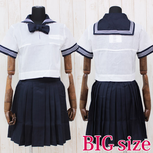 BIGサイズ:B〜106cm・W〜88cm 上衣:着丈46cm 袖丈22cm 肩幅45cm スカート丈49cm リボン100cm セット内容:上衣(前ボタン留め、襟・袖に各3本ライン入り、横ファスナー)、スカート(ウェストに一部ゴム入り、ボタン留め、横ファスナー)、リボン 素材:上衣(綿35%、ポリエステル65%) 他(ポリエステル100%)