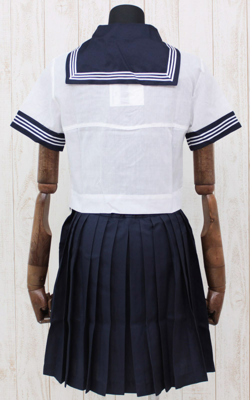 セーラー+リボンの最強コンビ!可愛らしさ全開の夏用セーラー服。●ホワイト×ネイビーの定番カラー●襟と袖口に華奢な三本ラインをON●プリーツが揺れる膝丈スカート●フロントで結べるリボン付き。ちょこんと小さなリボンで可愛さ倍増!長さはたっぷり100cmあるので結び方をオリジナルに変えてみてもオシャレ。爽やかな愛らしさを演出できる白いブラウスの制服コスチュームです。※水洗い不可、塩素系漂白剤による漂白不可、アイロンは中温で当て布使用、ドライクリーニング可、色落ちの可能性があります、ご注意ください。※こちらの商品は在庫の状況によりお届けまでに4日〜7日程度かかる場合がございます。