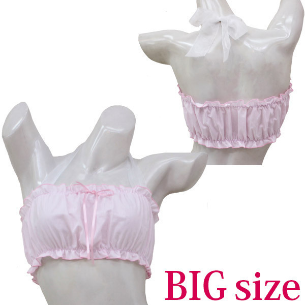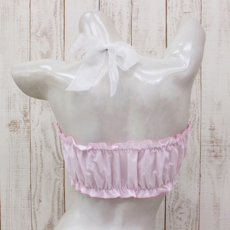大きめBIGサイズ!ふんわりスイーツ感が漂うパステルピンクのホルターブラジャー単品。●ストレッチゴムでギャザー寄せ・くしゅくしゅ感がラブリー●肩紐を隠せばセクシーなチューブブラに・結んでホルターにするとずり落ちません●フリル部分はしっかり縁処理済み。フロント中央に可愛いリボン飾りをつけてロマンチックなランジェリーに仕立てました。※水洗い不可、塩素系漂白剤による漂白不可、アイロンは中温で当て布使用、ドライクリーニング可。※こちらの商品は在庫の状況によりお届けまでに4日〜7日程度かかる場合がございます。