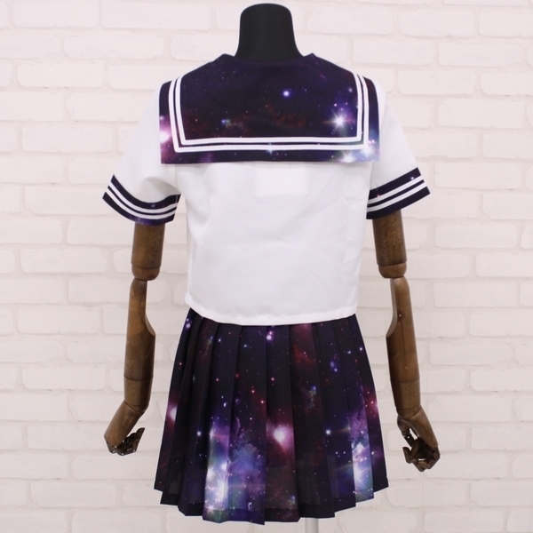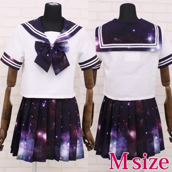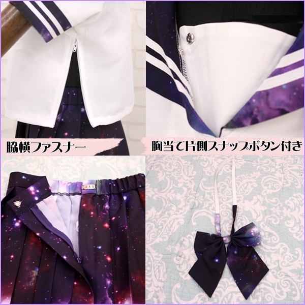 ロマンティックで幻想的な宇宙柄♪フォトプリントデザインのセーラー服コスプレ。●インパクト抜群の宇宙柄●オシャレで神秘的な紫カラー●セーラートップス&スカート●お揃い柄のリボンもセット。数多の星や銀河が美しい宇宙柄がプリントされたセーラー服コスチューム!黒や白のニーハイからハイソックスまで何でも合わせられます。※水洗い不可、塩素系漂白剤による漂白不可、アイロンは中温で当て布使用、ドライクリーニング可、色落ちの可能性があります、ご注意ください※本製品は、生地の裁断工程により柄の位置(模様)に個体差が生じます。