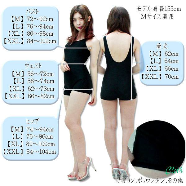 Lサイズ:B76〜94cm・W58〜74cm・H76〜96cm 着丈64cm セット内容:水着単品(前身頃全面に裏地付き、胸部にパット付き) 素材:ナイロン、ポリウレタン、その他