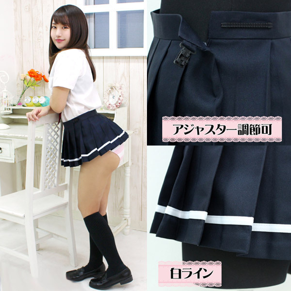 > 超ミニ無地プリーツスカート単品 紺×白ライン BIG