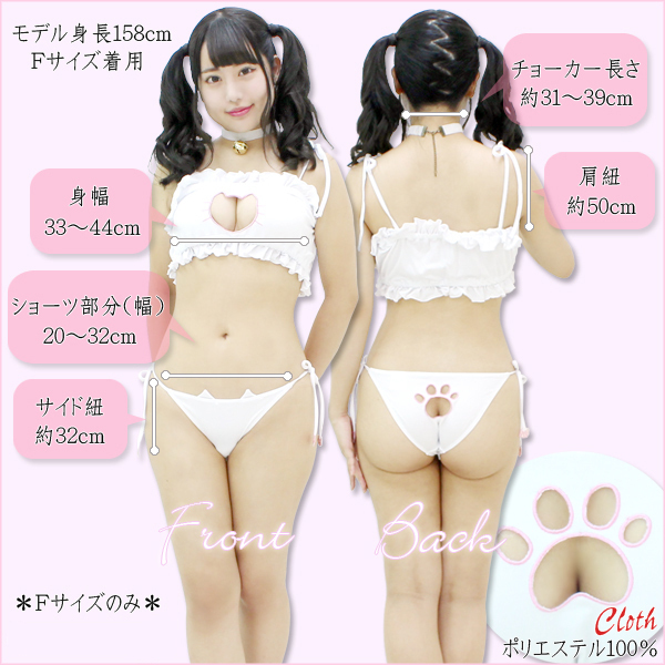 キミのために可愛くなるにゃん♪男女問わずハートを射止めるキュートな猫モチーフの水着が登場しました!フリル×猫のコラボレーション!ブラやショーツに所々取り入れられたネコが乙女心をくすぐります♪さらに後ろで留めるタイプの鈴つきチョーカーも付属。別途で猫耳カチューシャや尻尾を取り入れれば、気持ちは擬人化した猫の気分!?自宅でハロウィンパーティを開くならセクシーな仮装コスチュームとして使えますし、他にも自分へのご褒美や彼へのサプライズ演出にも是非どうぞ♪※水洗い可、塩素系漂白剤による漂白不可、アイロンは中温で当て布使用、ドライクリーニング可、色落ちの可能性があります。