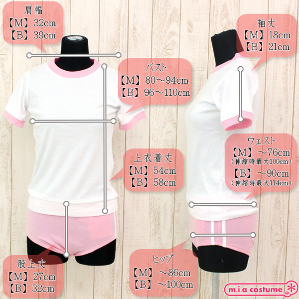 BIGサイズ B96〜110cm・W〜90cm(伸縮時最大114cm)・H〜100cm 上衣:着丈58cm・肩幅39cm・袖丈21cm ブルマ:股上丈32cm セット内容:上衣、ブルマ 素材:ポリエステル65%、コットン35%