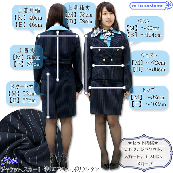 Bサイズ シャツ:B〜108cm・肩幅45cm・袖丈23cm・着丈58cm ジャケット:B〜104cm・肩幅46cm・袖丈59cm・着丈57cm スカート:W〜88cm・H〜102cm・着丈57cm エプロン:総丈102cm スカーフ:89×89cm セット内容:シャツ、ジャケット、スカート、エプロン、スカーフ
