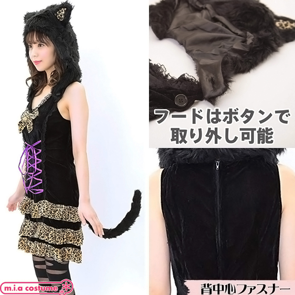可愛い女豹に変身できる!ふんわりボリューミーな猫耳フードがついたハロウィン仮装。ファーの質感や長めの尻尾で獣感をアップ!ヒョウ柄の3段フリルや鈴付きのリボンがとってもキュートな一着♪ストレッチ性の高い高級感のあるベロア生地を使用しているので、心地良く着用していただけます。◎フロントの編み上げはサイズ調整可能、フードの取り外し可能※塩素系漂白剤&水洗い不可※水洗い不可、塩素系漂白剤による漂白不可、アイロンは低温で当て布使用、石油系ドライクリーニング可、色落ちの可能性があります。※こちらの商品は在庫の状況によりお届けまでに4日〜7日程度かかる場合がございます。