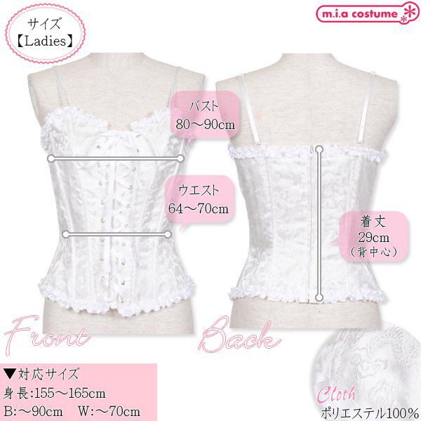 フリーサイズ:B80〜90cm・W64〜70cm・着丈29cm セット内容:コルセット単品(裏地なし、背面ファスナー) 素材:ポリエステル100% 対応サイズ:身長155〜165cm・B〜90cm・W〜70cm