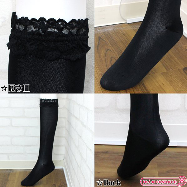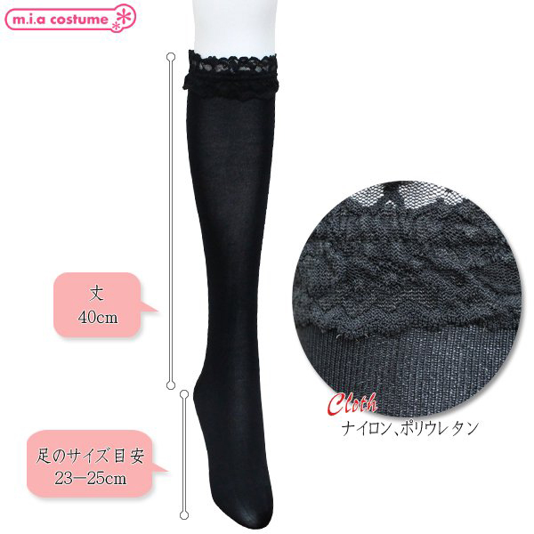> ソフトナイロンレース付ハイソックス 黒 無地 40cm丈 23〜25cm