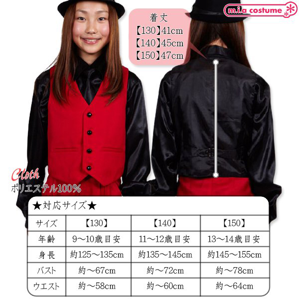 130サイズ 対応サイズ:身長125〜135cm・B〜67cm・W〜58cm 実寸:着丈41cm セット内容:ベスト単品(前ボタン) 素材:ポリエステル100%