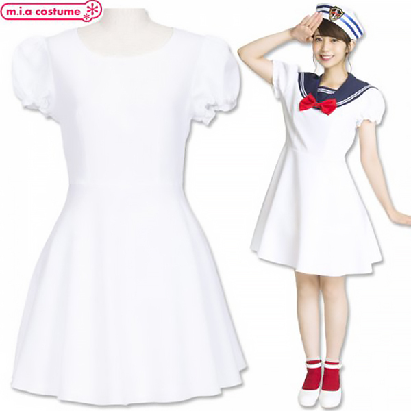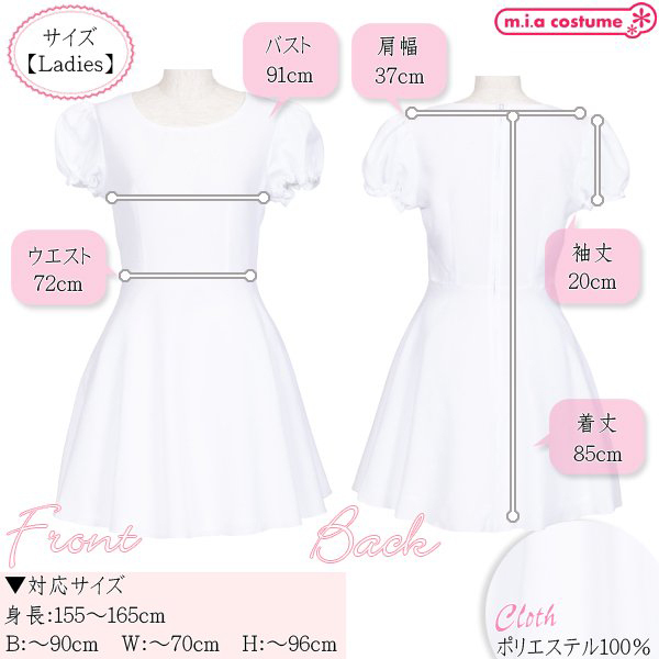 対応サイズ:身長155〜165cm・B〜90cm・W〜70cm・H〜96cm 実寸:B91cm・W72cm・肩幅37cm・袖丈20cm・着丈85cm セット内容:ワンピース単品(背中心ファスナー) 素材:ポリエステル100% モデル身長155cm