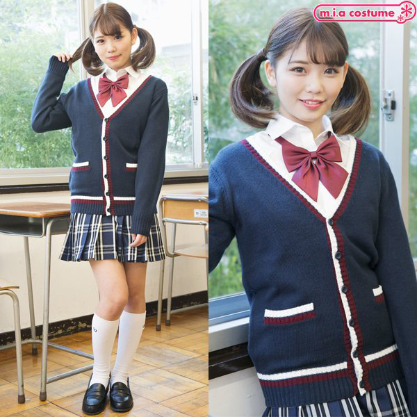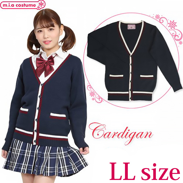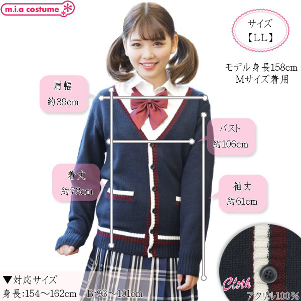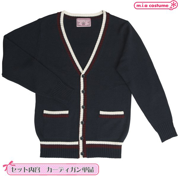 制服コスプレや普段使いにもオススメのカーディガンです。落ち着きのあるネイビーカラーで配色ラインをスッと効かせて、メリハリ良く仕上げた柔らかく肌触りのよいニットカーディガンです♪V字形にスッキリと開いたネックは、ネクタイなどの小物使いも良く映えます。ボタンはニットと同色に染めていて、左右にポケットが付いているから着回しも抜群!寒い季節や制服コスプレに欠かせないアイテムです♪※液温30℃限度、洗濯機の弱水流又は弱い手洗いが良い、塩素系漂白剤による漂白不可、アイロンは低温で当て布使用、石油系ドライクリーニング可、日陰のつり干しが良い、洗濯用ネットに入れてニット用中性洗剤で洗濯してください。
