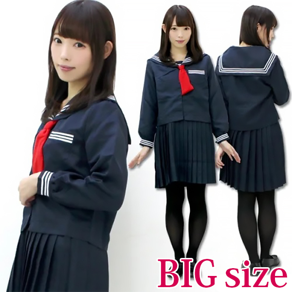 BIGサイズ:B88〜107cm・W76〜88cm・肩幅44cm・袖丈59cm・着丈(上衣53cm、スカート53cm)・吊り紐の長さ(片側)〜95cm セット内容:上衣(前開きボタン留め)、吊りスカート(横ファスナー、アジャスター調整可)、タイ 素材:ポリエステル100%