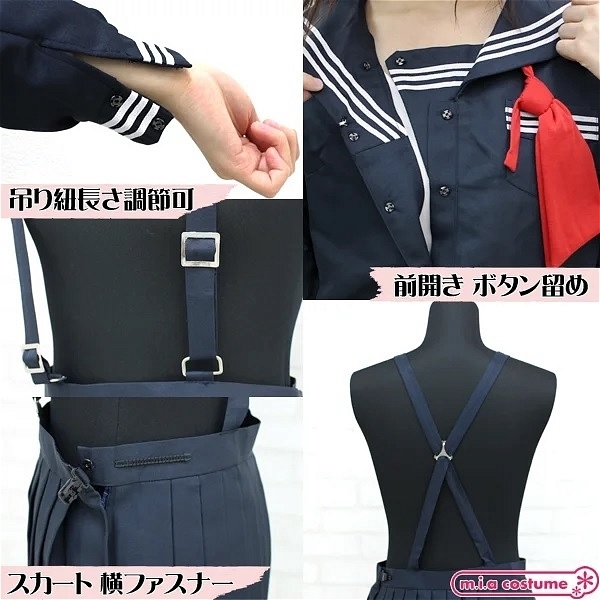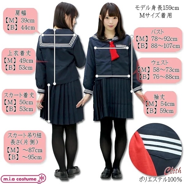 とある小学校の冬制服の赤タイ版が登場です。紺地に赤色はとっても映えます!シンプルなセーラー服ですが、吊りスカートがセットになっている本格派♪つくりはかなりしっかりとしているので本物と区別がつかないくらいのクオリティの高さです☆もちろん上下セットでお買い求めいただけます。※水洗い不可、塩素系漂白剤による漂白不可、アイロンは中温で当て布使用、ドライクリーニング可、色落ちの可能性がありますのでご注意ください。