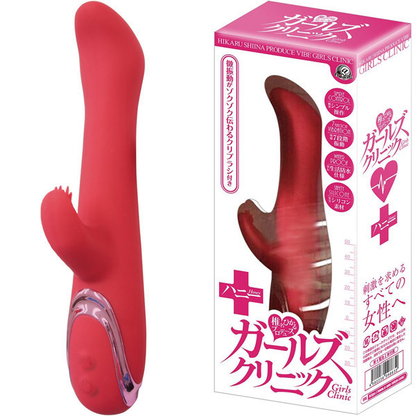 女性の性感帯を全て知り尽くした、AV女優「椎名ひかる」がプロデュース!クリバイブ付きバイブレーター「ガールズクリニック ハニー」。シリコン素材でつくられた本体は優しい挿入感。7つの振動パターンがアソコとクリを同時に猛攻撃!特にブラシ状のクリバイブから伝わるゾクゾク感がたまりません。また、生活防水仕様なので使用後のお手入れもスムーズにでき、いつでも清潔!大人可愛いデザインが女性ウケ抜群のアイテムです。