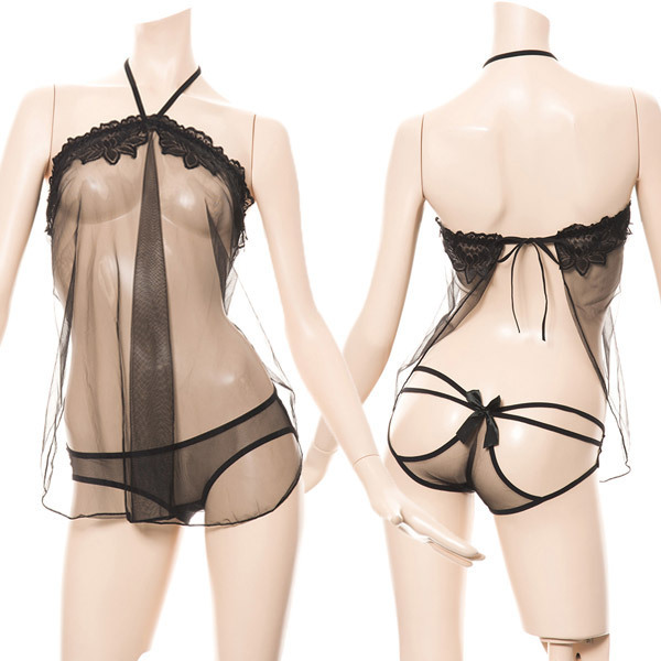 バックスタイルで魅せる大人スタイル♪極薄ベールでふんわり包んだセクシーベビードールセット。●エプロン風ホルターベビードール●シアー感抜群のフロントベール●バスト周りが華やぐエレガントレース●大胆ヒップカットのデザインショーツ●ヒップを可愛く飾る中央リボン付き●フロントはシンプルなメッシュ仕上げ。ボディをそっと包むゆるシルエットが可愛らしい印象を与えつつも、大胆なデザインで悩殺できちゃうランジェリーです。