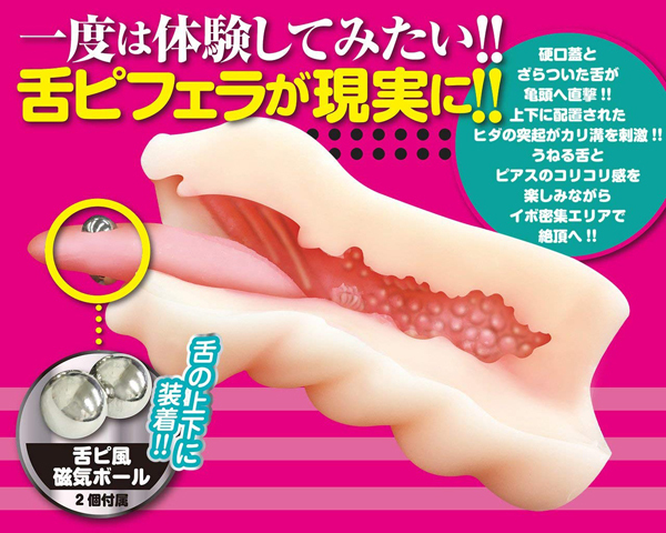 「舌ピフェラビッチ」が夢の舌ピアスフェラを体験できるオナホールとして登場!亀頭をコロコロ擦り上げるひんやりとした舌ピアスや着脱可能な磁気ボールがカリ溝に引っかかり、刺激を与えます♪柔らかな素材で、ハードなホールが苦手な人でも安心!磁気ボールは自由な位置に装着可能で硬口蓋とざらついた舌が亀頭へ直撃し、上下に配置されたヒダの突起がカリ溝を刺激♪うねる舌とピアスのコリコリ感を楽しみながらイボ密集エリアで絶頂へと導きます!まさに舌ピフェラビッチの魅力をたっぷりと味わえる非貫通型フェラホールです。※磁力ボールによる変形を防ぐため、保管時は必ず取り外すようお願いいたします