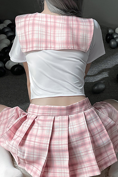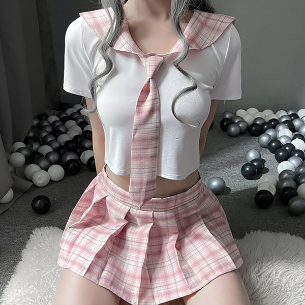 ストレッチ素材でボディにしっかりフィット!短めの丈が可愛らしいランジェリー感覚で制服コスが楽しめるセットです。ゆるく弧を描くセーラーカラーは、どこかノスタルジックな印象♪淡いピンクのチェックが可愛らしく、ブラウスはストレッチ生地がベースなのでフィット感も抜群!スカートはマジックテープ留めのラップタイプでネクタイは首ひもの長さを調節できます。