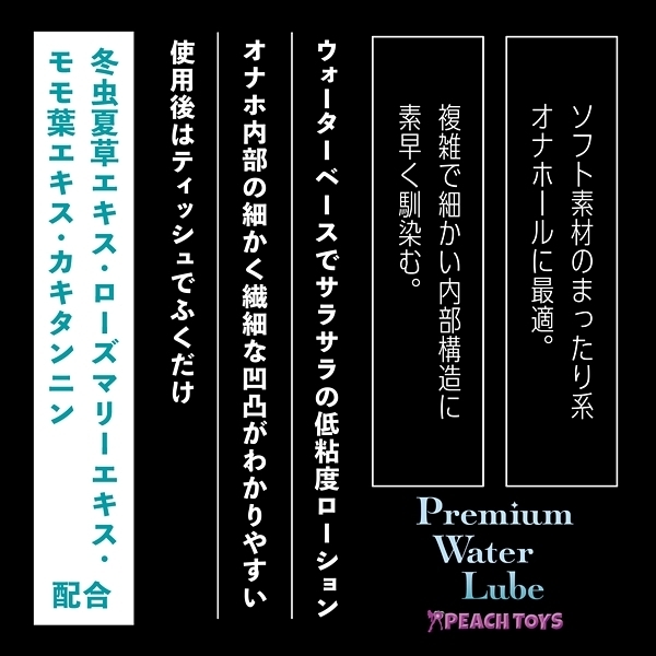 『水のように滑らか、でもヌルヌル感持続!ふき取るだけでOK!』「ふくだけローションPremium Water Lube (180ml)」が、ラベルデザインと容量・成分をリニューアルして再登場です!黒いポンプの「ふくだけPWL」は、【低粘度+シャバシャバ系】ソフト素材のまったり系オナホールに最適。複雑で細かい内部構造に素早く馴染む。冬虫夏草エキス・ローズマリーエキス・モモ葉エキス・カキタンニン配合●ウォーターベースでサラサラの超低粘度ローション●オナホ内部の細かく繊細な凹凸がわかりやすい●使用後はティッシュでふくだけ簡単●無香料●安心の日本製●500ml スタンダード <成分>水、プロパンジオール、ヒドロキシエチルセルロース、乳酸、キサンタンガム、ローヤルゼリーエキス、アルギニン、マカエキス、水溶性コラーゲン、グリチルリチン酸2K、ローズマリーエキス、モモ葉エキス、カキタンニン、銀、フユムシナツクサタケエキス、クエン酸、クエン酸Na、BG、エタノール、セルロースガム、炭酸水素Na、フェノキシエタノール、EDTA-2Na、ブチルカルバミン酸ヨウ化プロピニル