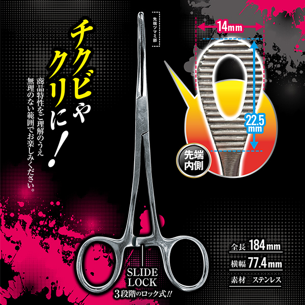 ステンレス製のハサミ型クリップでしっかりと固定できるジョークグッズです♪先端の内側にはギザギザの突起があり、滑りにくく安定したホールド感を実現!3段階のスライドロック機構でお好みの位置に調節可能です♪本体は鉗子のような形状で、見た目もユニーク!趣向を凝らした遊び心あるアイテムとしてお楽しみいただけます♪挟んだままの状態でぶら下げたり、角度を変えたりと用途はさまざま!材質は頑丈なステンレス製♪