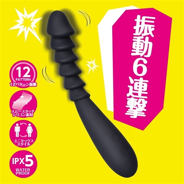 6連続の挿入感が楽しめるユニセックススティックの振動タイプ。出し入れする度にポコポコ続く快感に振動がプラスされてより刺激的なプレイが実現。充電式のリチウムイオン電池は90分充電で45分使用可能。12パターンの振動を好みに合わせて楽しめます。素材は滑らかで肌触りの良いスムースマットシリコン素材採用。IPX5の防水性能で使用後はしっかり洗えて衛生的に遊んで頂けます。絶妙なソリ具合とサイズ感・柔らかさにこだわった特殊形状バイブスティックです。
