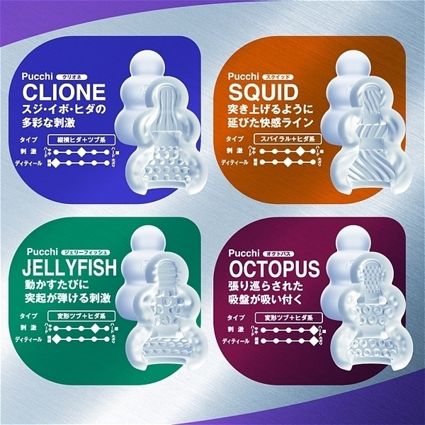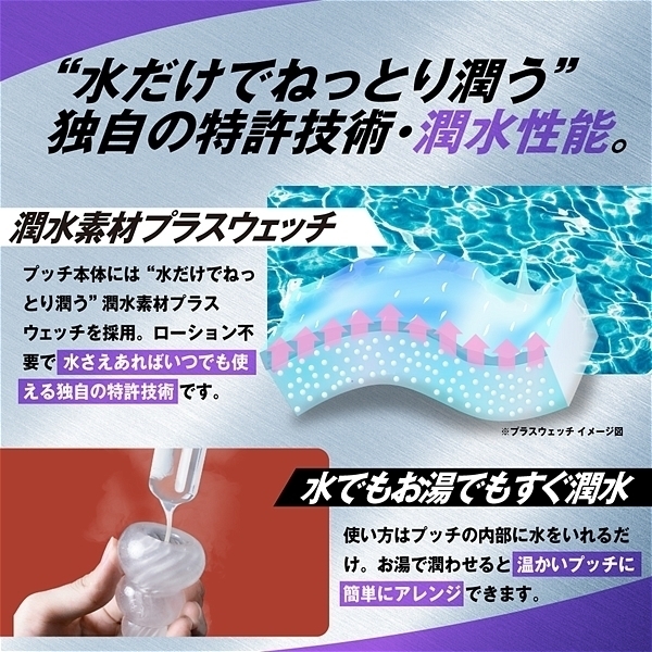 プラスウェッチは独自開発の新素材。水をつけて軽く擦ることで内部の超ミクロサイズで閉じ込められた「潤いゼリー」が水に反応し、沁みだし樹脂表面をねっとりと潤い包みこみます。<デコボコ感さらにクッキリ。>「HD(High Definition)成形」で突起のデコボコ感がさらにクッキリになりました。突起に触れたときの粒立ちが違います。<クリオネ内部構造>「スジ・イボ・ヒダの多彩な刺激」大ぶりの突起たちが全体を大胆に刺激する<ジェリーフィッシュ内部構造>「動かすたびに突起が弾ける刺激」長めに作られた突起が全体を弾いて刺激する<オクトパス内部構造>「張り巡らされた吸盤が吸い付く」吸盤とイボが密着し触感を生み出す<スクイッド内部構造>「突き上げるように延びた触感ライン」大きく隆起をしたスリットが奥へ奥へといざなう