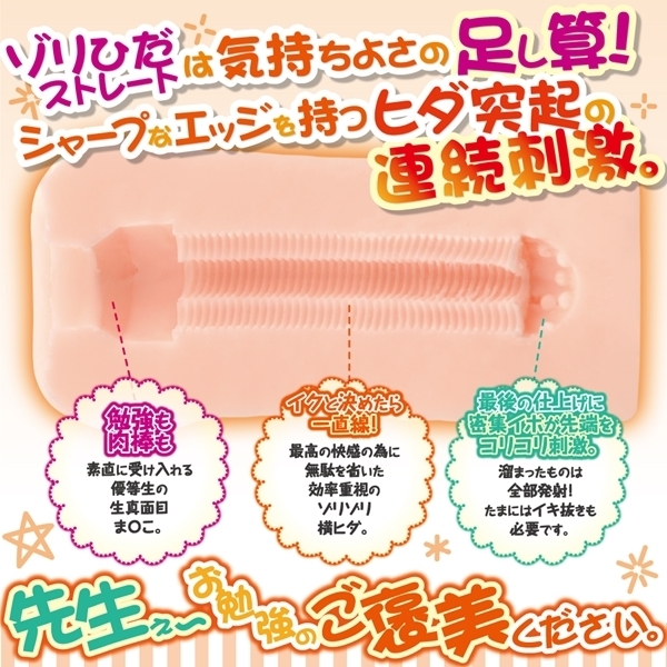 家庭教師になって生徒とエッチなお勉強!シャープなエッジの横ヒダがゾリゾリ連続刺激!思春期娘は横ヒダメインのゾリゾリ強刺激ホール。挿入直後から始まる怒涛のゾリゾリ刺激。エッジの効いた細めの横ヒダが360度余すところなく擦り上げます。道中はキュッと締め付ける狭穴仕様。最奥のバキュームポイントにはポコポコイボを配置して最後の最後まで刺激し続けます。重量は391gと、肉厚感と扱いやすさを両立しました。絶え間なく押し寄せるゾリゾリ刺激を、お勉強そっちのけで楽しんでください。