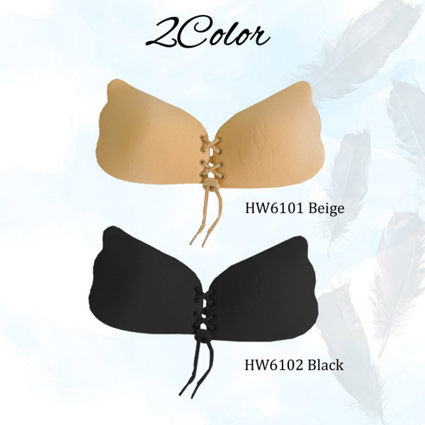 寄せて上げて谷間もメイク♪天使の羽型シリコンブラ「フェザーアップブラ ベージュA」。羽のようなカップがボディに馴染みやすいベージュカラーのモールドブラ!カップ内側は粘着シリコン樹脂、外側はサラリとした肌触りのポリエステル素材です。中央はアジャスターで自在に調整できる編み上げ仕様!胸のボリュームを強調したい場合は少し上目で着用し、紐を持って留め具を上下させるだけで自由に谷間をメイク出来ます。【着用方法】両手でカップを外に向けて反らし、最適な位置にあわせてから外に反ったカップを胸の方向に戻して、ふちが胸につくように指先でなぞって下さい。左右着用後、両手でカップをしっかり押さえて定着させ、留め具をスライドしてお好みで調整して下さい。粘着効果が薄れた際は、一度水洗いし乾燥させてから再度着用して下さい。※サイズは画像を参考にお選びください※通常よりワンサイズ小さめが綺麗に着用できる目安です※Bサイズ(h00035)もございます