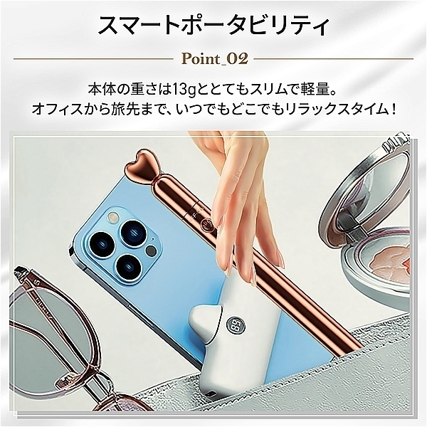 携帯に便利な手のひらサイズのスタイリッシュなマッサージャーが登場!10種の振動パターンでご自身のライフスタイルに合わせて使い分け。ハート型のキャップがとても可愛く印象的。健康とリラクゼーションを目的としたフェムケア用品となり女性でも安心してご利用いただけます。※充電の際は、ハート部分(キャップ)を少しだけ反時計回りに回し引っ張ると、充電の差込口があります。●カラー:ローズゴールド