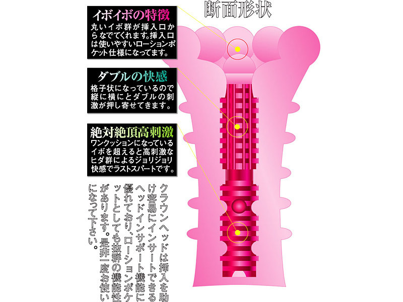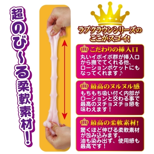 こんなによく伸びるホール見たことない!最大約92cmも伸びる、超もっちり柔軟素材のオナホール(非貫通型)。内部は格子状で縦横から波のように刺激します。最奥直前にあるイボを超えると横ヒダが出現し、絶頂へ導く高刺激を送ります。ローションポケットにもなるイボイボ群のヘッドインサポート形状で、勃ちにくい時も根元まで挿入を手助けしてくれる次世代オナホールです。※実際に限界まで伸ばそうとすると本体が破損しますので、使用する際は通常のオナホールと同様にお取り扱い下さい。