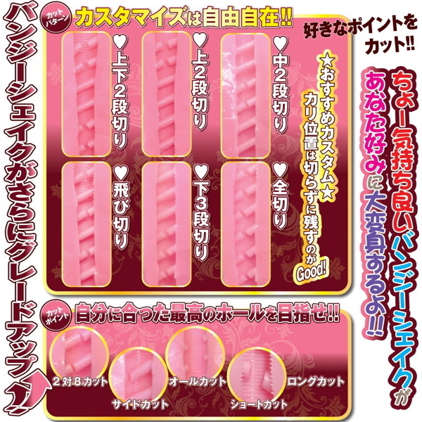 オナホ界の革命児!?ムービング形状の非貫通型オナホール「バンジーシェイク」がさらに進化して登場!内部のストリングスが、前作の3本から6本になりました。多彩な快感を生む6連ストリングスと、3段階の細かい螺旋ヒダで極上快感!内部のストリングスはカットして、自分好みにカスタマイズ可能!また、洗浄時に裏返しやすい蛇腹ボディを採用し、より扱いやすくなっています。グレードアップした「バンジーシェイク グランツ」で、未知の快感を堪能してください。