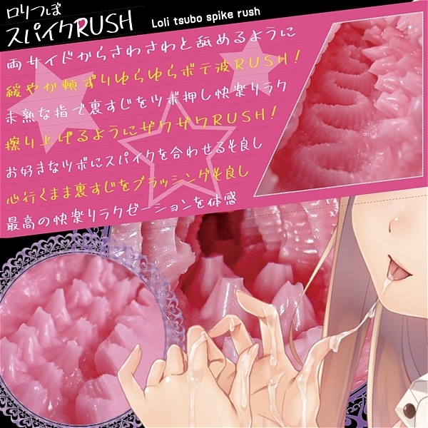 ツボ押し系リラクベーションホール。気持ちイイ所をざわざわっとスパイクイボが強力ツボ押し!繊細なロリ指テク体感、この快感が癖になる裏すじイボブラッシャー構造。両サイドからさわさわと舐めるように緩やか頬ずりゆらゆらボテ波RUSH!未熟な指で裏すじをツボ押しリラク。探り上げるようにザワザワRUSH!お好きなツボにスパイクを合わせるも良し。心行くまま裏すじをブラッシングも良し。最高の快楽リラクゼーションをお試し下さい。