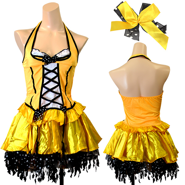 カラフルで大きな蝶々フォルムの羽付き♪セクシー&キュートなミツバチ風のコスプレ衣装。コルセット風の編み上げトップス&ボリューミーな光沢サテンのミニスカートがセットになった上下2ピースタイプ!柔らか素材のホルタートップスはビスチェのようにガーターストラップがついたセクシー仕様!スカート裾にはゆらゆらと揺れるシースルーの飾りをたっぷりON♪羽はゴム&※セット内容以外は付属しておりません。