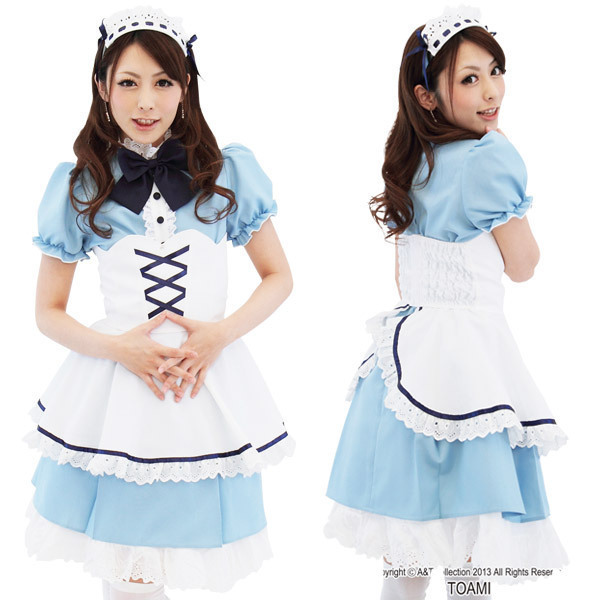 清楚な雰囲気たっぷり!サックスブルーが目に鮮やかなメイドコスプレ衣装。エプロンのフロントに施したネイビーの編み上げリボンが、クラシックな雰囲気を演出。ヘッドドレス調のカチューシャが気分を盛り上げるメイドコスチュームです。※ストッキングは付属しません