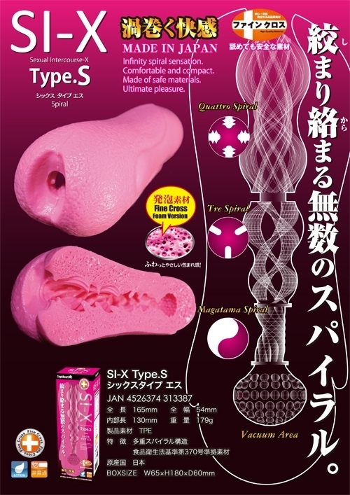 驚異的な人気を誇るSI-Xシリーズに新作が誕生!その名も「SI-X Type.S(シックス タイプエス)」。高品質の発泡素材「ファインクロス」を使用した、ふわっふわの本体内部には4つの仕掛けが!まず前半部分では、肉棒に絡み付き優しく撫で上げるような感触を。後半部分では、勾玉形の穴と無数のイボイボが亀頭を集中攻撃!気分が最高潮な時にフィニッシュを迎えられます。また、まったりからキツキツまで刺激を自由に変えることもポイント。これひとつで何通りもの刺激が味わえる贅沢なオナホールです。ローション付属。