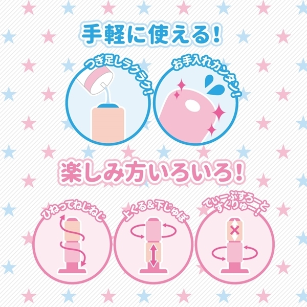 可愛いイラストが描かれたパケ買い必至の日本製オナホ。「にこにこいもうと」は360度大小様々なイボが張り巡らされたイボ壁が特徴!全長75mmと小さめに設定されているため、別売りの「やんちゃばーじょん(t10581)」と同時使用することで刺激倍増♪ランダムに動かせば超絶快感が体験できる!捻り、回転、ディープスロートなど好みの刺激をお楽しみ下さい。お手入れし易い貫通式