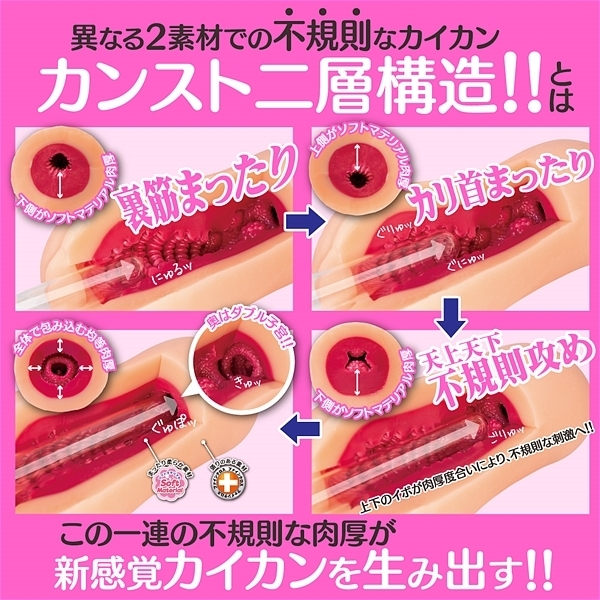 前半はドゥルドゥル、グニュグニュな強刺激!カリ首と裏筋に連続で押し寄せる連撃。奥にはランダムに現れる大粒のイボイボ!イボや壁には更に細かなつぶつぶが敷き詰められておりスキがない。最奥にはアナタを受け入れる準備万端のダブル子宮が待ち受ける!