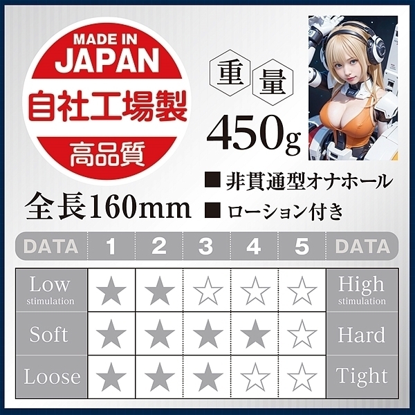 国内自社工場製の日本製。「AIが考えた内部構造」+「下部二層」の極上名器。AIが作る理想的なオナホールと理想的な女性イラスト、上は柔らか下は固めの「ソフト&ハードの片面二層」採用。空間を敢えて広くする事でバキューム効果を発生させる設計。弾力のあるフレキシブルスキン使用し高弾力・高伸縮、匂い控えめ。