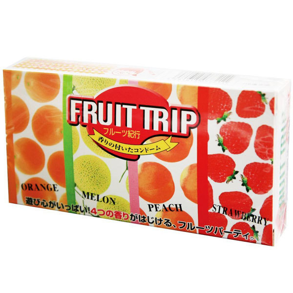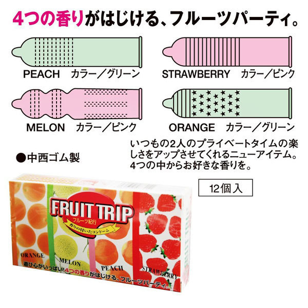 遊びゴコロ満載!4つの香りがはじけるフルーツフレーバー付きバラエティコンドーム「フルーツ紀行 12個入り」。異なる4つのフルーティーな香りでラブタイムをさらに楽しく!ピーチ(グリーンカラー)、ストロベリー(ピンク)、メロン(ピンクカラー)、オレンジ(グリーンカラー)計4種類の香り付きコンドームを詰め合わせたコンドームセットです。